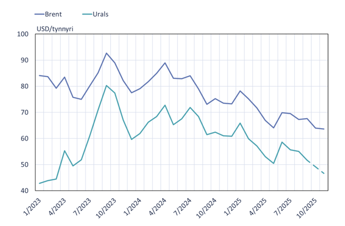 Toistaiseksi suurten ostajien reaktiot ovat vielä osin hämärän peitossa, mutta venäläisen raakaöljyn markkinahinnat ovat viime viikkoina laskeneet selvästi. Lehtitietojen mukaan Venäjän keskeisen vientilaadun hinta on painunut selvästi alle 50 dollarin tynnyriltä, kun myyjien on ollut aiempaa vaikeampaa löytää ostajia. Samalla Venäjän Urals- ja Pohjanmeren Brent-laatujen hintaero on kasvanut lähelle 20 dollaria. Ennen laajamittaista hyökkäystä hintaero oli tyypillisesti 1–2 dollaria, vuonna 2023 noin 23 dollaria ja viimeisen parin vuoden ajan noin 14 dollaria. Urals- ja Brent-laatujen suuri hintaero kuvaa osaltaan pakotteiden Venäjän taloudelle aiheuttamaa kustannusta.