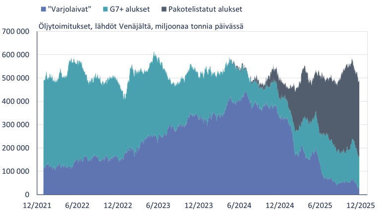 EU, Iso-Britannia ja Yhdysvallat ovat viimeisen vuoden aikana pakotelistanneet tiiviiseen tahtiin erityisesti huonokuntoisimpia ja selvästi pakotteita rikkovia varjolaivaston aluksia. Listatut alukset eivät voi saapua EU-maiden satamiin eikä niille saa tarjota mm. vakuutus-, huolinta- tai rahoituspalveluita. EU:n 19. pakotepaketin jälkeen listattuja aluksia on jo 557. Käytännössä pakotelistattujen alusten on erittäin vaikea toimia muualla kuin Venäjän, Iranin ja Venezuelan öljykaupan piirissä. Siksi pakotelistattujen alusten osuus Venäjän öljykuljetuksista on kasvanut nopeasti. Erityisesti raakaöljyn viennissä pakotelistattujen alusten osuus on jo nyt yli puolet. Marraskuussa pakotelistatut alukset vastasivat yli 60 prosentista raakaöljyn merikuljetuksista, kun pakotteita asettaneiden G7+ -maiden alusten osuus oli hieman alle 30 %. Öljytuotteiden viennissä G7+ -maiden alusten osuus on jonkin verran suurempi.