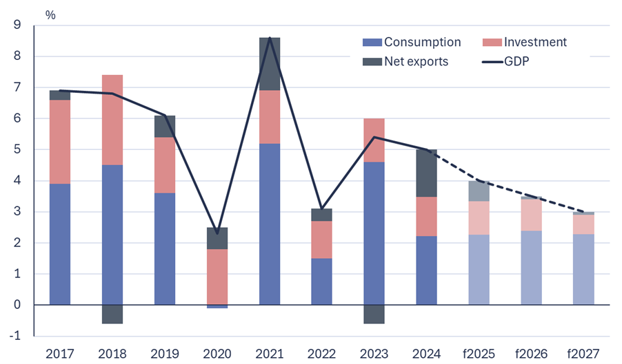 Figure 1. China’s GDP growth, factors contributing to growth and BOFIT forecast for 2025–2027