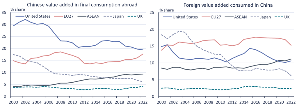 Final consumption of Chinese value added abroad (“exports”, left) and foreign value added consumed in China (“imports”, right)