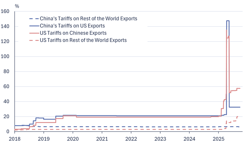 Effective tariff rates* between China and the US, as well as with the rest of the world (as of 25.9.2025)
