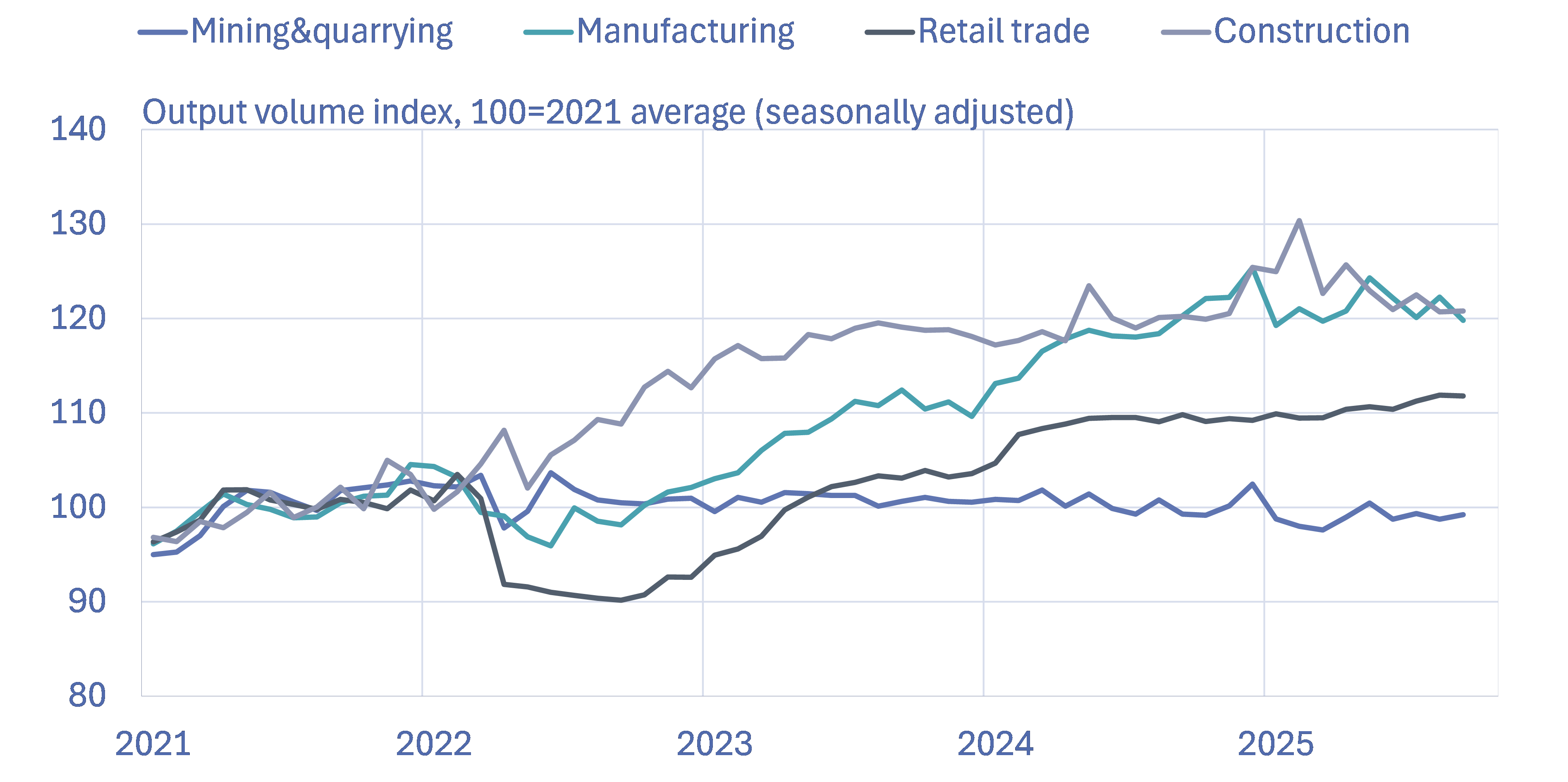 The decline in the mining & quarrying sector came to a halt in September, but for January-September as a whole, production was down by 2 %. Growth in manufacturing this year has only occurred in branches linked to the war effort and in the pharmaceuticals industry. Nearly all other manufacturing industries experienced negative on-year growth in January-September. Construction activity overall was stagnating in September. Housing construction in particular has developed weakly in recent months, declining by 12 % y-o-y in the third quarter.