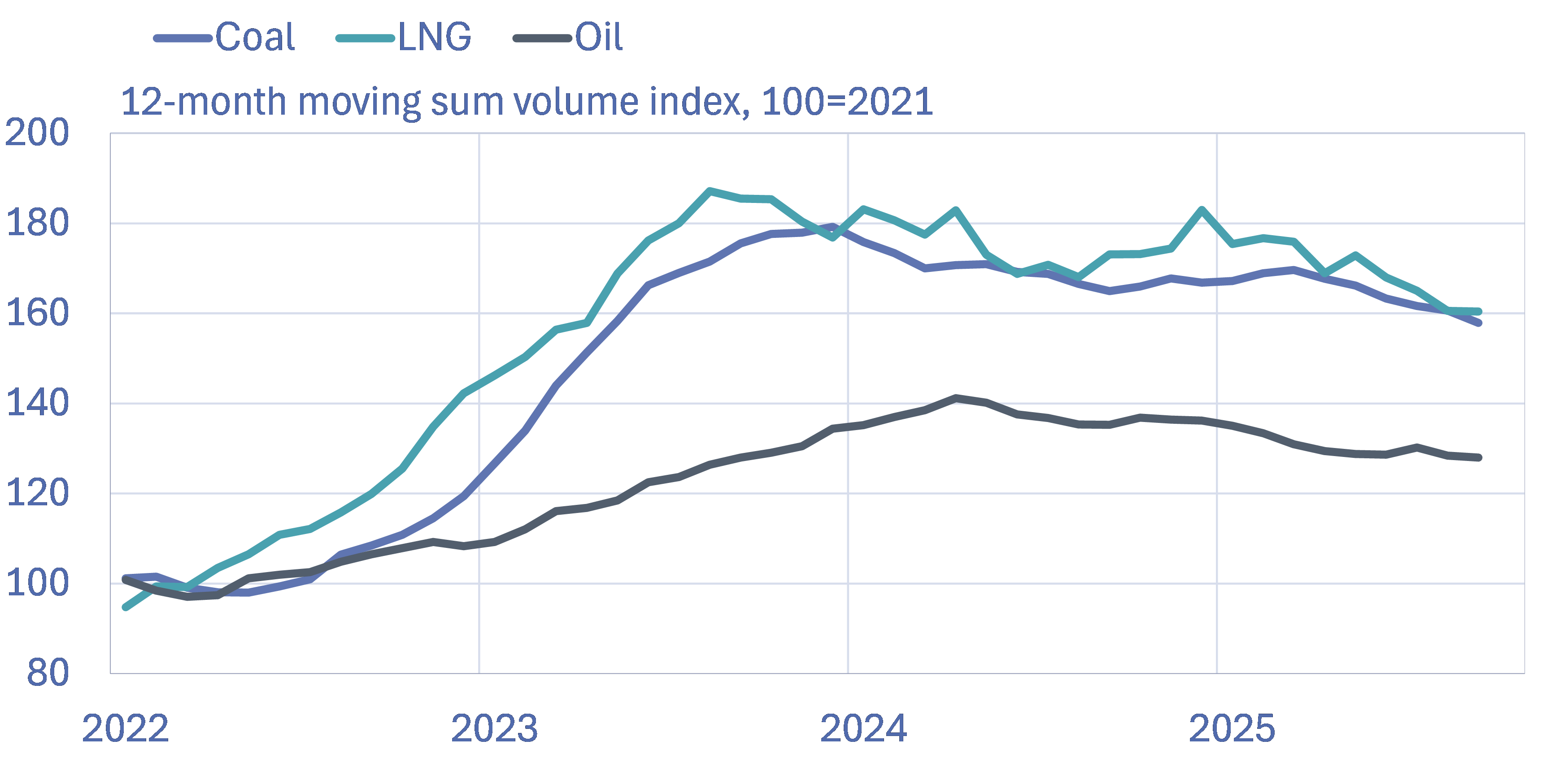 Mirror statistics show that Russian goods imports from China amounted to $74 billion in January-September, down 11 % y-o-y. The decline in imports is mainly due to vehicle imports, which have halved this year. Other imports grew overall by 2 % y-o-y. Imports have also decreased in many other product groups besides vehicles (e.g. electrical equipment). Imports have been reduced especially by Russian recycling fees that have substantially increased prices of imported cars. Demand in Russia is also generally weaker due to slowing growth. Western sanctions also complicate Russia’s trade with China particularly due to problems related to payments.