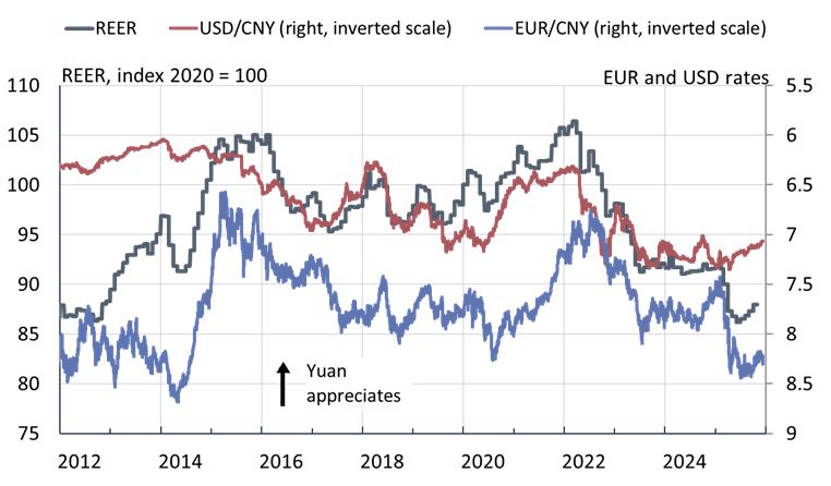 The yuan has appreciated modestly against the dollar this year, but has weakened against the euro and in REER terms