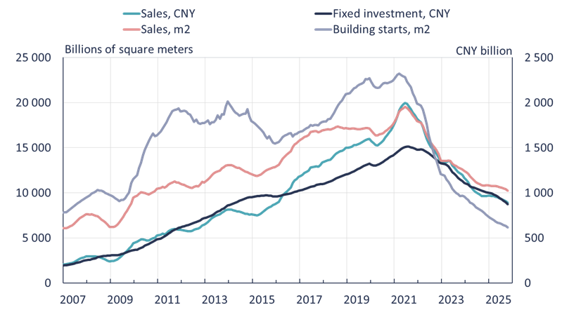 The financial struggles of property developers increased rapidly in 2021 when the authorities imposed three “red line” ratios to limit developer indebtedness (BOFIT Weekly 6/2021) and reduce risk in the sector. The restrictions on the overheated sector caused a severe contraction in the entire real estate sector over the next four years. And the downward spiral continues. In recent months, construction investment has declined by about 20 % y-o-y in nominal terms, while the volume of apartment sales (measured in square metres of floorspace) has also contracted by 20 %. The volume of new building starts has fallen by 30 % y-o-y. At the same time, a large number of properties under construction are still being completed in weak market conditions, and the volume of unsold properties (by floorspace) has continued to grow. The NBS reports new apartment prices have fallen by 10 %, while apartment prices on secondary markets are down 20 % from their 2021 peak. Anecdotal evidence suggests that the drop in apartment prices might have been more dramatic, making conditions in the sector a touchy political subject. In November, two large private housing market data companies were apparently ordered to cease releasing data.
