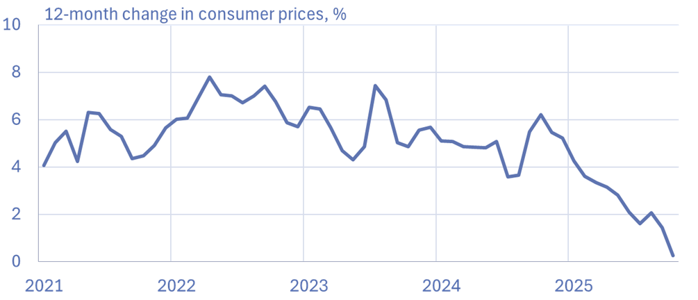 Latest data show that Indian GDP in July-September grew 8.2 % y-o-y. Private consumption growth accelerated to 7.9 %, reflecting the lowering of the Goods and Services Tax (GST) in September. On the other hand, growth in fixed investment slowed slightly and public consumption began to decline. Net exports also trended negatively. The shifts likely reflect protectionist winds in international trade and temporary domestic factors such as the spike in gold demand during the autumn Diwali “Festival of Lights” celebrations.