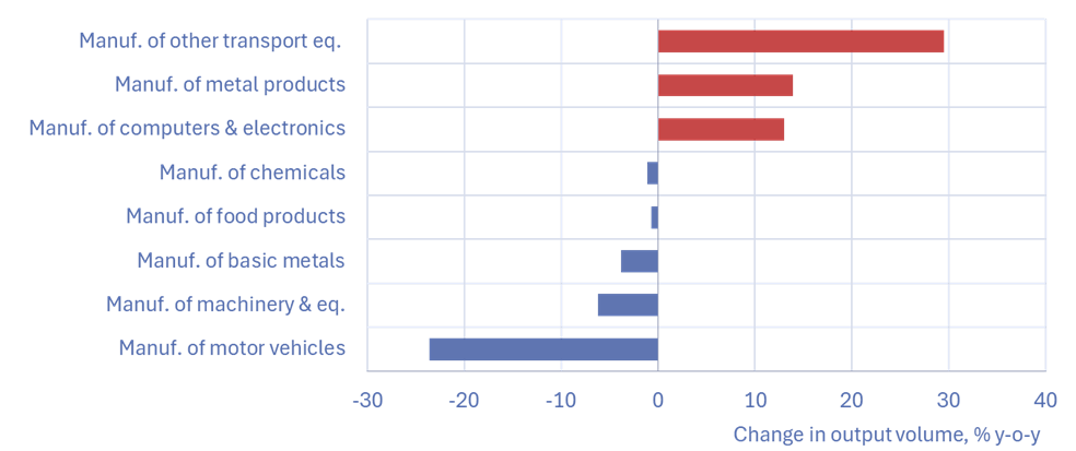 Output in the extractive industries grew by just under 1 % y-o-y in November. Natural gas production contracted, while coal production remained at the same level as a year earlier. Russia has ceased to release figures on crude oil production. According to Bloomberg sources oil production still increased in November but dropped sharply in December. Extraction, refining and export of crude oil has been complicated by Ukrainian drone strikes on oil infrastructure and US sanctions.