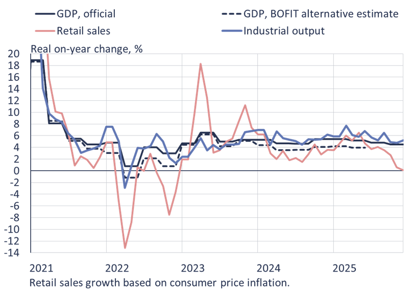 BOFIT's alternative GDP calculation suggests that economic growth for all of 2025 was roughly 1 percentage point below the official figure. The alternative GDP growth estimate for the fourth quarter was 3.3 %. Industrial output growth accelerated slightly in December from previous months to over 5 % y-o-y. For all of 2025, industrial output rose by roughly 6 % y-o-y. Foreign trade, which is closely linked to industrial output, remained strong throughout the year. Net exports clearly supported economic growth for the entire year.