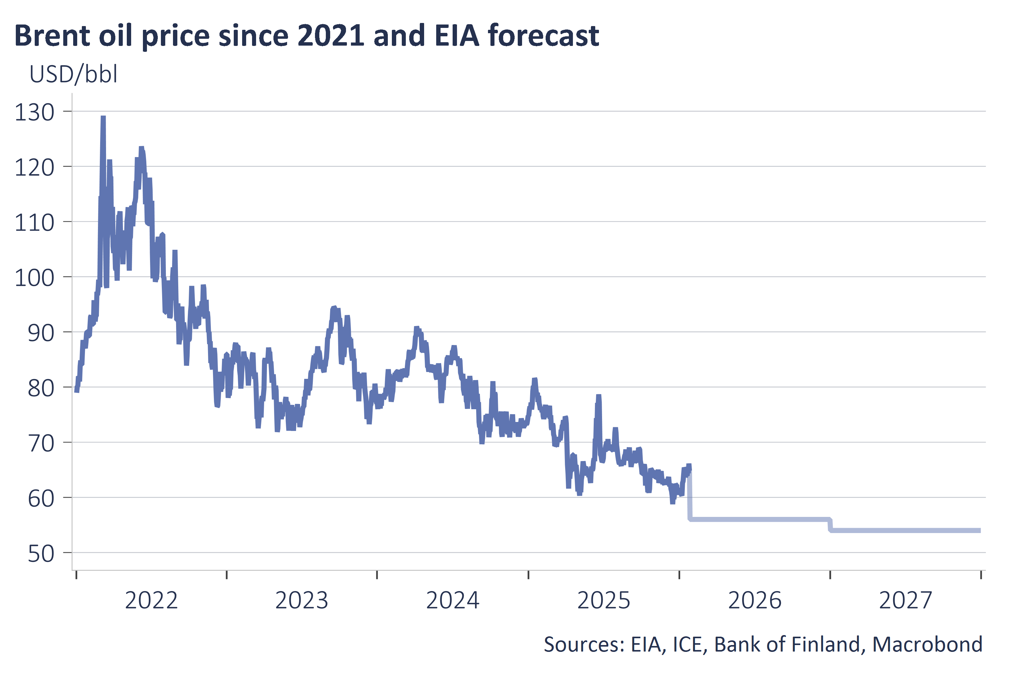 The US Energy Information Administration (EIA) expects the price of Brent oil to fall this year and next (figure). The US is the world’s largest consumer of oil and largest oil producer. In 2025, the US produced oil at a record level of 13.6 million barrels a day. The EIA expects lower oil prices to push US production into a slight decline in 2026–2027 as some investments cease to be profitable in the lower-price environment.