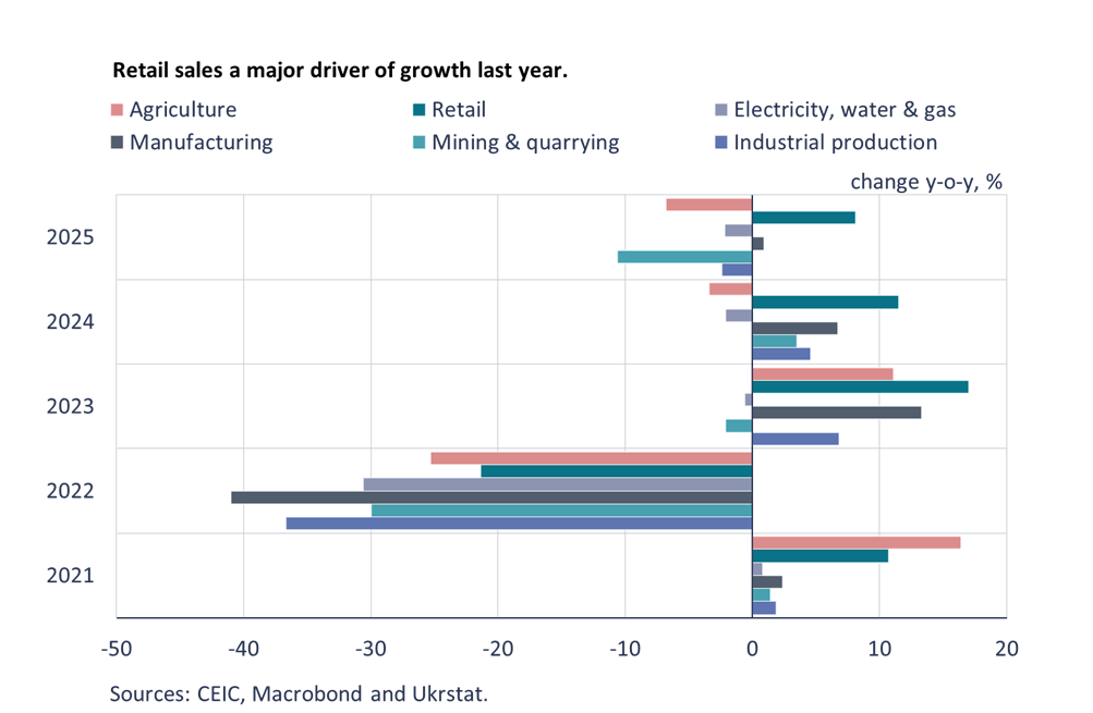 Energy shortages and loss of crucial production facilities reduced industrial output last year (down by 2.4 % y-o-y). Production in the mining & quarrying sector fell by 11 % y-o-y due to attacks on oil & gas production facilities and Russian occupation of the Pokrovsk coal mining district in the first half of the year. The lack of skilled labour and power outages, especially in the final months of last year, caused large bottlenecks in all industrial branches. Manufacturing, however, continued to show positive growth (up 1 %) due above all to growth in military-industrial branches. Ukraine’s defence industries, particularly drone manufacturing, have become economic successes with promising prospects for export growth in coming years. Our most recent BOFIT blog post discusses Ukraine’s wartime resilience and the rise of its defence sector.