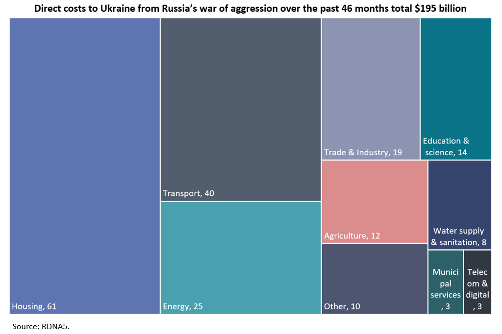 The fifth in a series of joint annual reports from the Ukrainian authorities, the World Bank, the European Commission and the UN on Ukraine’s war damage and reconstruction needs (Rapid Damage and Needs Assessment, RDNA5) put the total costs of the war to Ukraine as of end-2025 at $588 billion (about 500 billion euros), or roughly three times Ukraine’s 2025 GDP. The estimate assumes that reconstruction takes place over the next 10 years. The RDNA4 assessment put total costs at $524 billion.