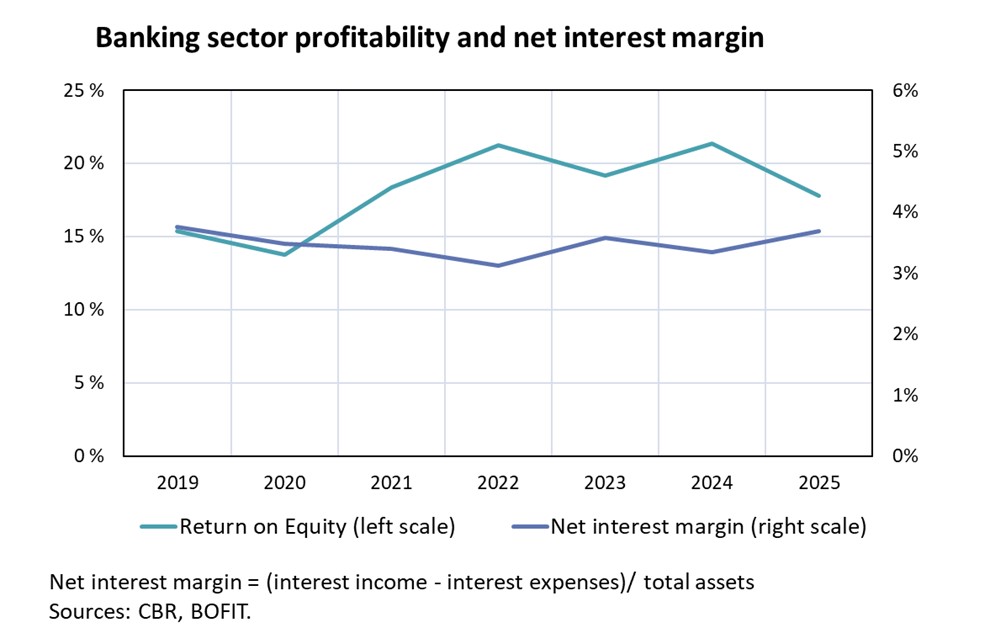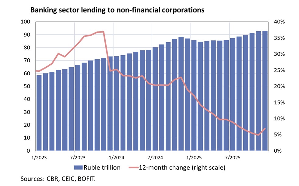 Russia’s financing system, which already relies heavily on banks, has seen the importance of domestic bank financing increase further due to Western sanctions. Additionally, a large share of government support is channelled to firms and households in the form of bank loans. Bank lending has grown rapidly since the summer of 2022, but the pace slowed markedly last year. In 2025, banks’ loan portfolios increased by 17 % compared with the previous year.