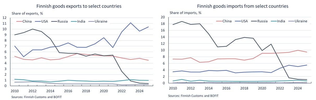 Electrical equipment and machinery accounted for over half of Finland’s goods imports from China. Imports of electrical equipment last year saw a particularly steep decline (down 16 % y-o-y), with imports of lithium-ion batteries and smartphones from China decreased markedly. The value of many other import goods, including foodstuffs, clothing, textiles and chemicals, also declined. Moreover, Finland last year imported roughly 1,000 less electric vehicles from China than in 2024, and the decline in value was 20 % y-o-y. Chinese imports may have partly shifted to duty-free low value parcels (less than 150 euros). The delivery volumes of low-value items soared last year. Finnish Customs reports that nearly 40 million low-value packages from China with a total value of 221 million euros were shipped to Finland last year, a 35 % increase from 2024. The EU has decided to eliminate the duty-free status of low-value items. From the start of July, all low-value packages will be subject to a 3-euro customs duty.