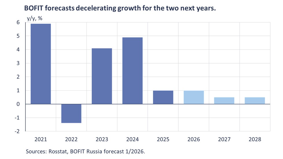 The latest BOFIT Forecast for Russia sees GDP growth this year remaining close to last year’s 1-percent pace, with growth slowing to around ½ percent in 2027 and 2028. State stimulus measures applied in previous years yield diminishing returns as the labour force is nearly fully employed. Our forecast assumes that sanctions pressures will remain in place and world-market prices for crude oil will average that of mid-March oil futures during the 2026–2028 forecast period.