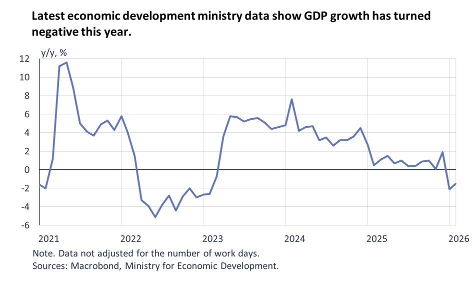 The preliminary GDP assessment from Russia’s economic development ministry shows that the Russian economy in February experienced negative 12-month growth for the second consecutive month. The last time such weak growth was seen was in early 2023. Industrial output stumbled in February, with manufacturing contracting by nearly 3 % y-o-y. While there was still positive growth in branches serving the military-industrial complex and pharmaceuticals, output in other industries contracted. The output of the mining & quarrying sector (includes oil & gas) rose by nearly 1 %.