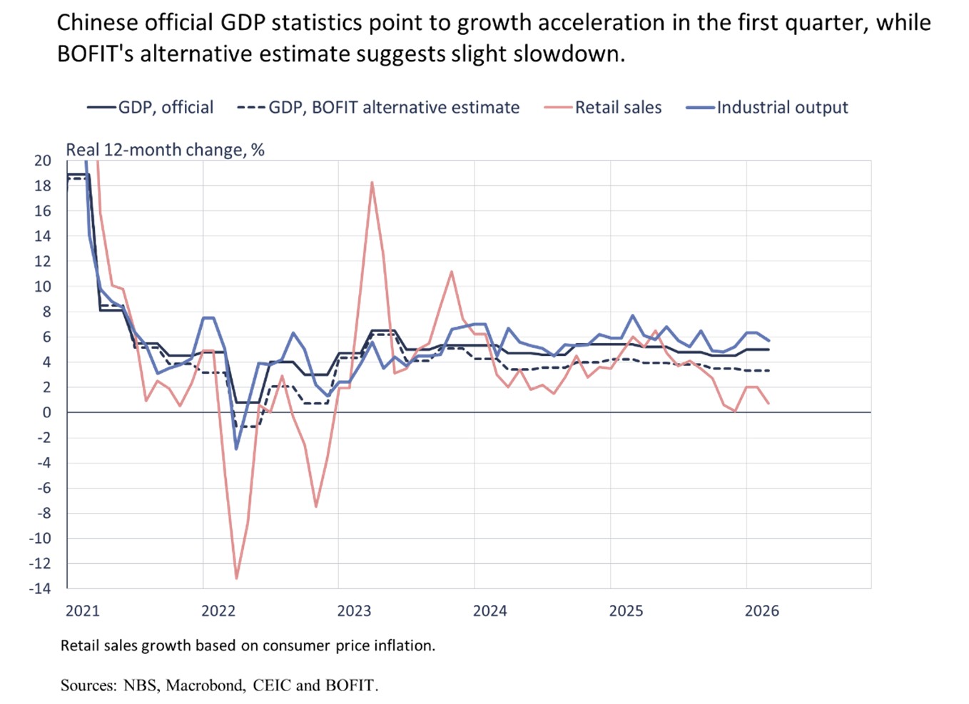 China’s National Bureau of Statistics (NBS) reported on Thursday (April 16) that GDP growth accelerated to 5.0 % y-o-y in the first quarter of 2026, up from 4.5 % in 4Q25. According to the demand breakdown, the growth pickup was driven by rapid investment growth. It seems that in particular investment in production machinery and equipment grew very rapidly, likely related to the continued strong growth in industrial output and exports. Growth in retail sales was subdued in the early part of the year as the effects of government support programmes are fading. Contrary to the official data, BOFIT’s alternative GDP calculation suggests that GDP growth slightly slowed down in the first quarter. In conjunction with the release of our Forecast for China 2026–2028, BOFIT will hold a webinar briefing on Tuesday May 5 (sign-up link here).