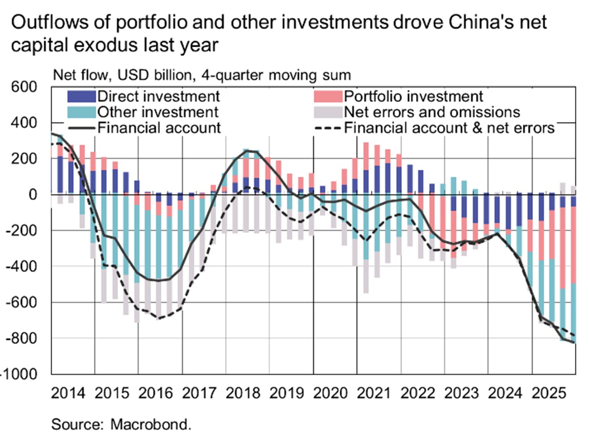 Outward portfolio investment in the fourth quarter amounted to $97 billion, and $360 billion for all of 2025. At the same time, foreign investors reduced their investment positions in China by a total of $65 billion for all of 2025 (including a $20 billion decrease in the fourth quarter). This translates to a net outflow of portfolio investment of approximately $425 billion during 2025. BOFIT provides a deeper dive into portfolio flows and yuan-denominated cross-border flows in a recent BOFIT Policy Brief 1/2026.