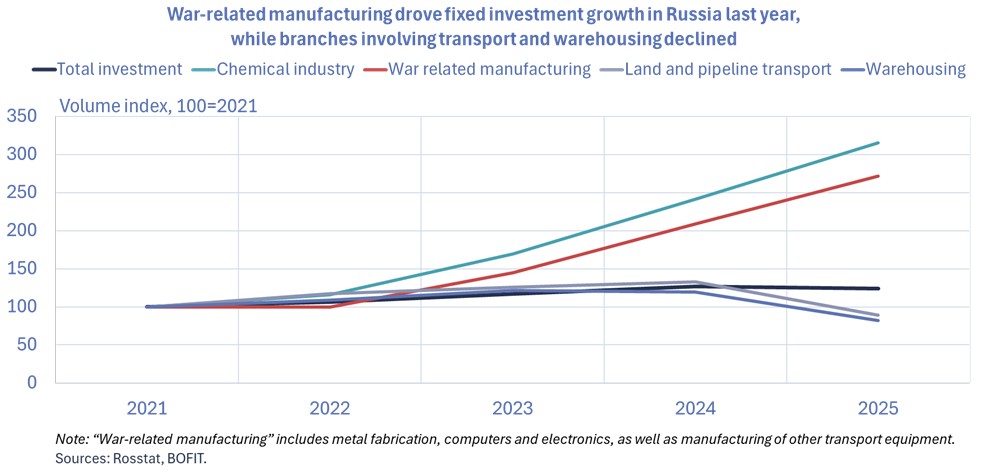 Russian GDP growth slowed significantly last year. The slowdown was broad-based, but gross fixed capital formation even contracted slightly. The years 2022–2024 witnessed historically high fixed investment growth averaging 9 % a year. National accounting figures show investment stalled, contracting by 0.4 % last year. Total fixed investment amounted to around 50 trillion rubles ($600 billion), which corresponds to roughly 23 % of GDP.