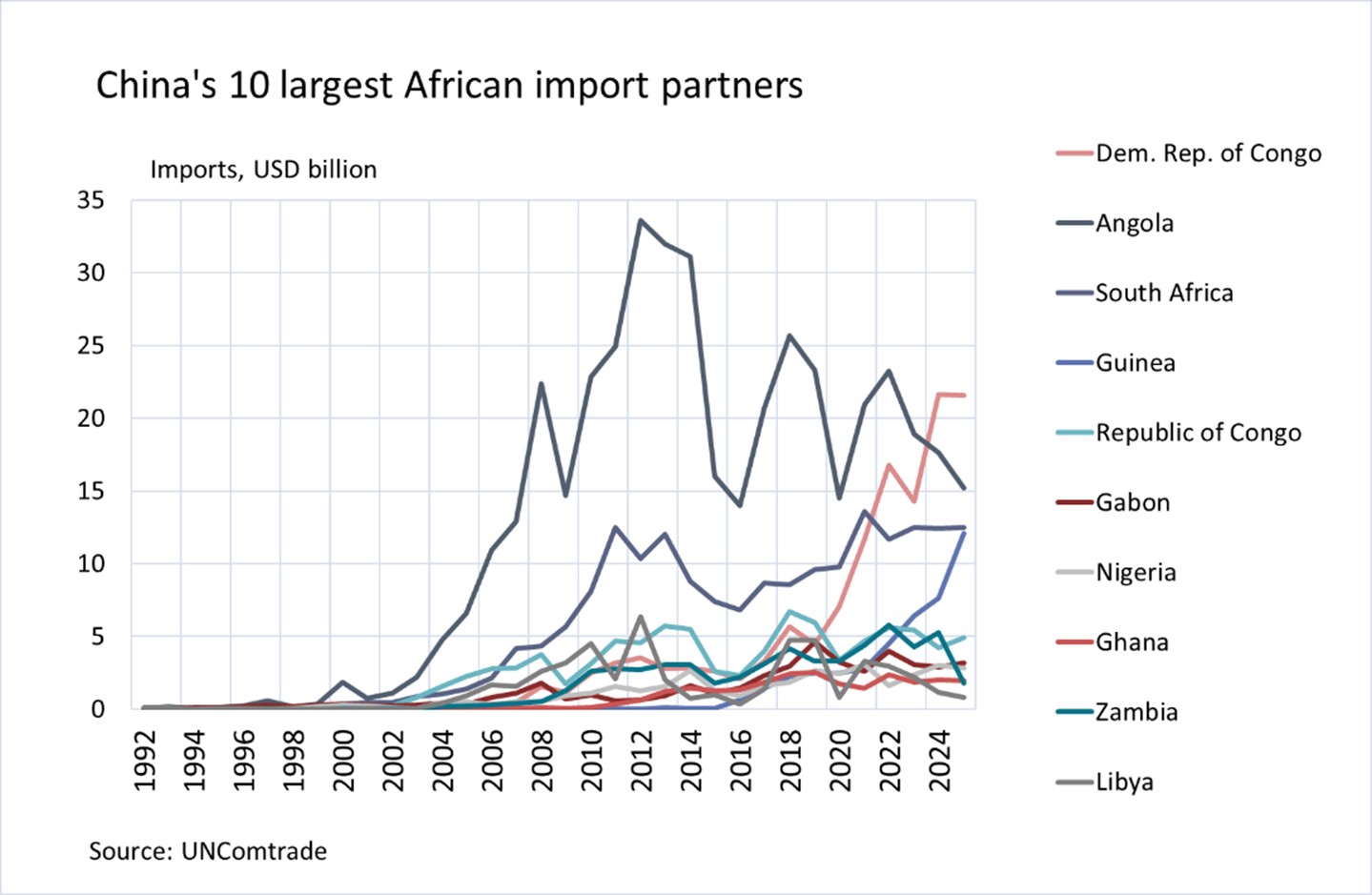 China mainly imports raw materials from Africa. Nearly 70% of Africa’s exports to China are oil, gas and other minerals. Metals constitute the second largest product group, accounting for about a quarter of China’s imports from Africa. Fruits and vegetables represent about 3 % of China’s imports from Africa, followed by chemicals (1.5 %) and plastics (1 %). China’s metal imports focus on the Democratic Republic of Congo (DRC), South Africa and Zambia, while the biggest suppliers of oil and other minerals are Angola, Guinea and South Africa. Fruits and vegetables are mainly imported from Ethiopia and Nigeria, chemicals from Namibia and plastics from Ivory Coast. Africa’s total share of China’s goods imports was 6.5 % at the end of 2025.