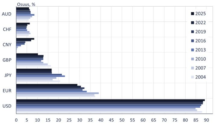 Kansainvälinen järjestelypankki BIS julkaisi syyskuussa kolmen vuoden välein tehtävän valuutta- ja OTC-johdannaismarkkinakyselyn tuloksia. Juanin osuus valuuttakaupassa kasvoi kolmessa vuodessa 7 prosentista 8,5 prosenttiin vuonna 2025. Juan pysyi viidenneksi vaihdetuimpana valuuttana. Yhdysvaltojen dollari kasvatti osuuttaan maailman vaihdetuimpana valuuttana 89,2 prosenttiin kaikista transaktioista (88,4 % vuonna 2022). Euron osuus hieman laski ja se oli toiseksi vaihdetuin valuutta 28,9 prosentin osuudella (30,6 % vuonna 2022). Jenin osuus pysyi käytännössä muuttumattomana 16,7 prosentissa ja punnan osuus laski 10,2 prosenttiin (12,9 % vuonna 2022). Hongkongin dollari oli yhdeksänneksi vaihdetuin valuutta 3,8 prosentin osuudella ja Intian rupia 1,9 prosentin osuudella sijalla 11. Osuudet summatuvat 200 prosenttiin, koska valuuttakauppaa käydään kahden valuutan kesken.