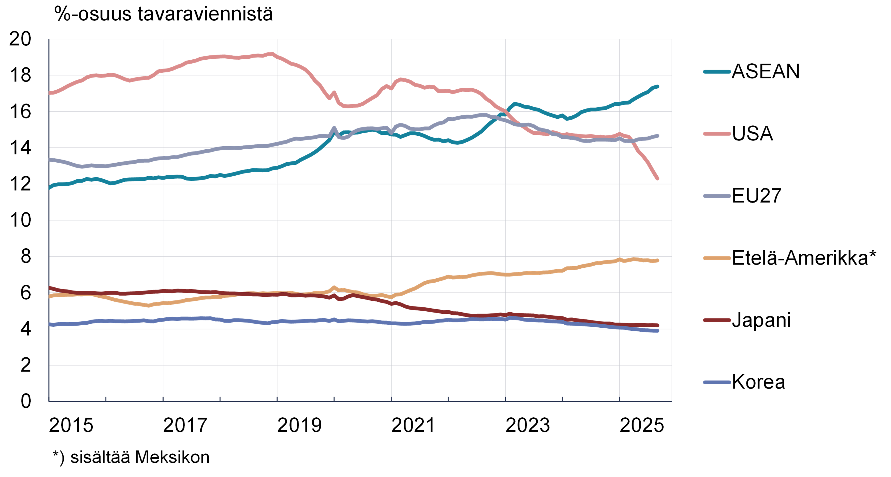 Jonkinasteisesta välirauhasta huolimatta Yhdysvaltojen ja Kiinan välinen kauppasota otti lokakuussa jälleen uusia kierroksia. Kiina ilmoitti uusista vientirajoituksista, jotka koskevat harvinaisia maametalleja 1.12. alkaen ja akkuteknologiaa 8.11. alkaen. Harvinaisten maametallien osalta rajoitukset kohdistuvat erityisesti tiettyihin magneetteihin ja materiaaleihin, joita valmistetaan myös ulkomailla käyttäen kiinalaisia raaka-aineita tai teknologiaa. Akkuteknologian vientirajoitukset koskevat erityisesti huipputason akkuja, joita käytetään puolustuksessa, ilmailussa ja energiavarastoinnissa, sekä keskeisiä akkumateriaaleja, joiden globaalia tuotantoa Kiina hallitsee. Yritysten on haettava vientilupaa Kiinan kauppaministeriöltä (MOFCOM), ja aiempien kokemusten perusteella lupien käsittelyä voidaan strategisesti hidastaa, mikä aiheuttaa viivästyksiä toimitusketjuissa.
