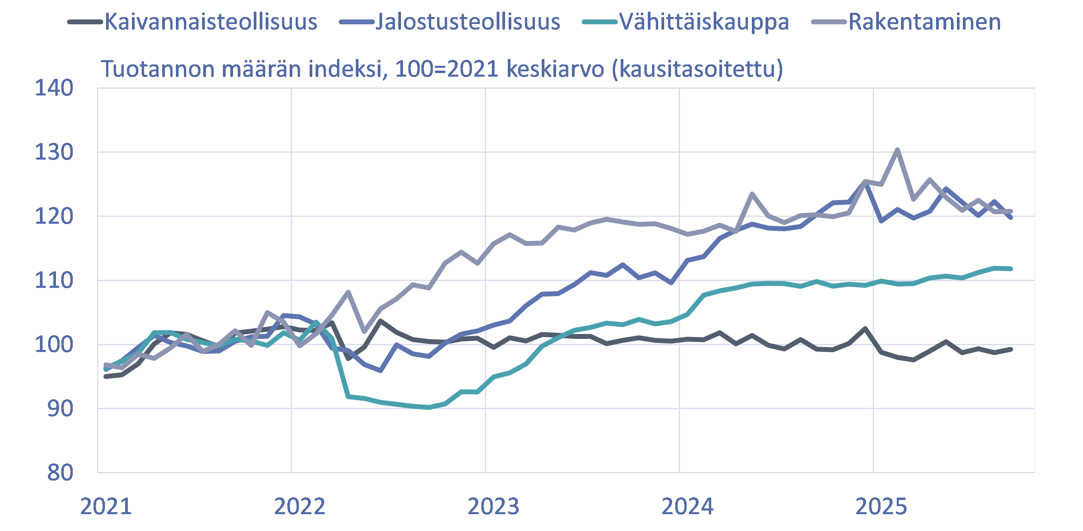 Kaivannaisteollisuuden alamäki pysähtyi syyskuussa, mutta tammi-syyskuussa kaivannaisteollisuuden tuotanto supistui 2 %. Jalostusteollisuudessa kasvua on tänä vuonna ollut käytännössä vain sotaan kytkeytyvillä teollisuudenaloilla sekä lääketeollisuudessa. Lähes kaikilla muilla jalostusteollisuuden aloilla tuotantoa oli tammi-syyskuussa vähemmän kuin vuotta aiemmin. Rakennustuotanto polki edelleen paikallaan syyskuussa. Etenkin asuntorakentaminen on kehittynyt viime kuukausina heikosti ja supistui vuoden kolmannella neljänneksellä 12 % vuotta aiemmasta.