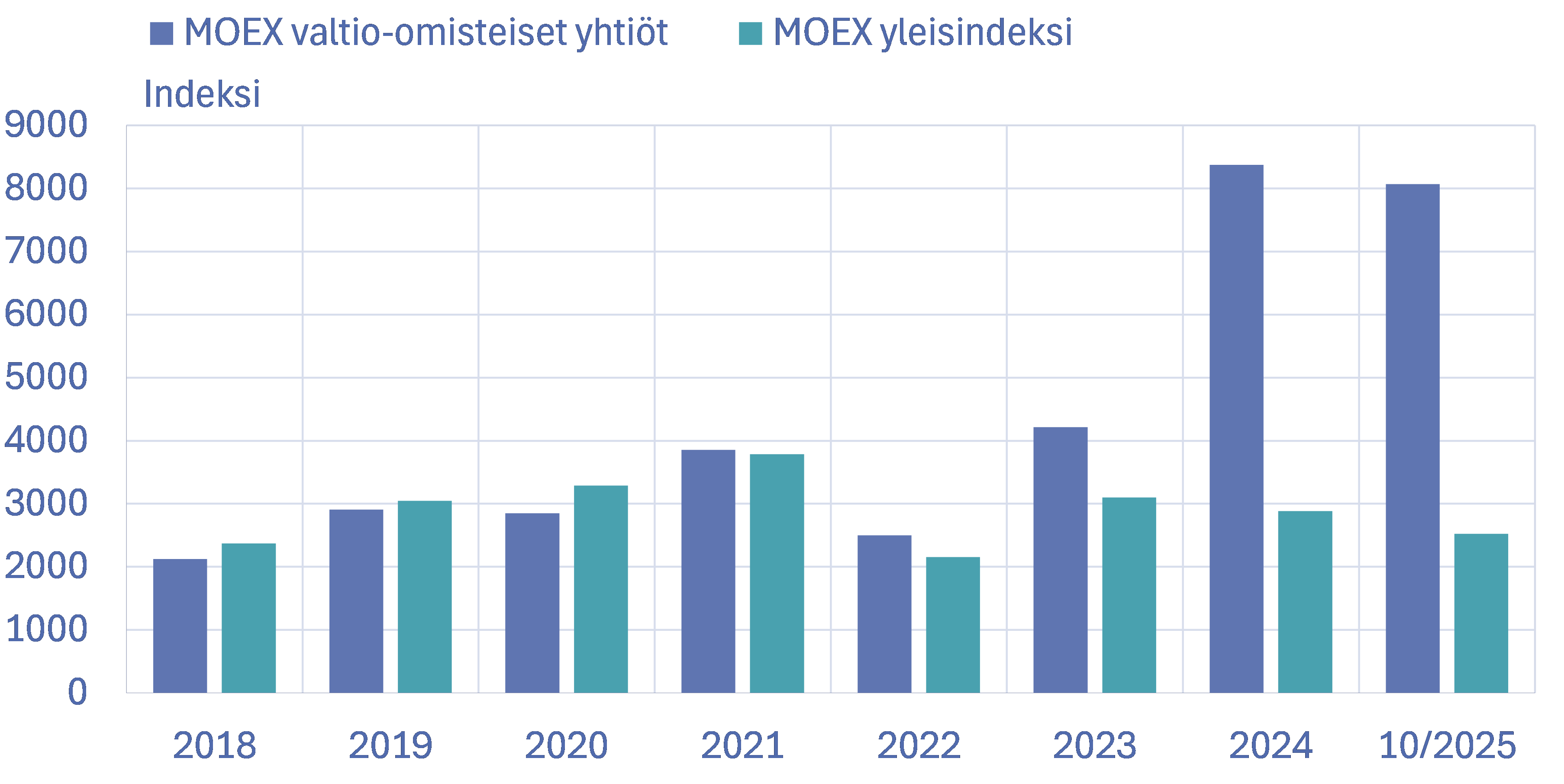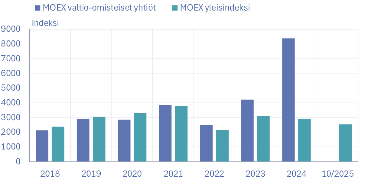 Huom. MOEX julkaisee valtio-omisteisten yhtiöiden indeksin vain kerran vuodessa. Indeksin painot eivät ole julkisia, eikä kuluvan vuoden lukua ole siksi saatavilla.