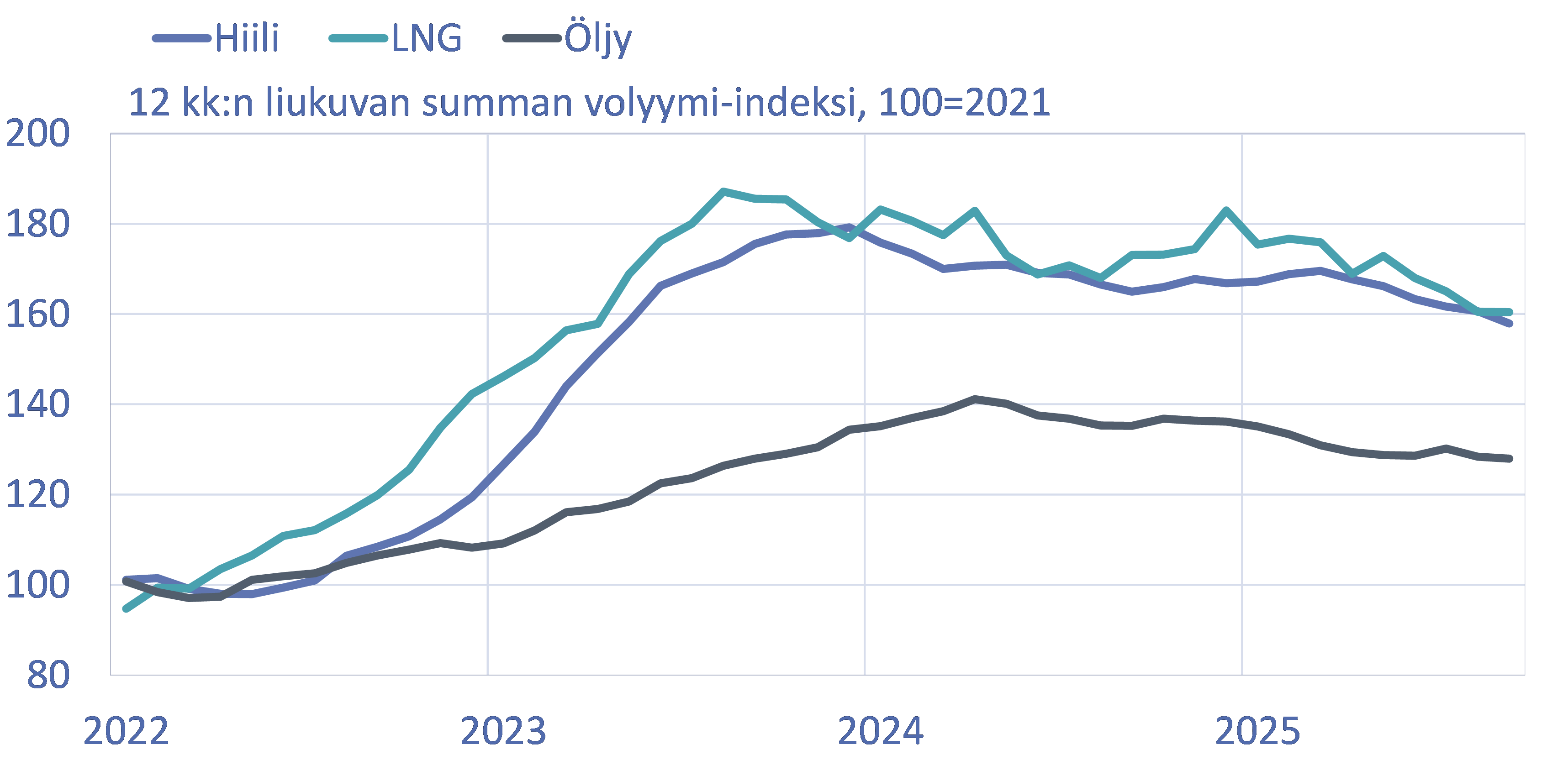 Venäjän tavaravienti Kiinaan (peilitilastojen pohjalta) oli tammi-syyskuussa 89 mrd. dollaria eli 7 % vähemmän kuin vuotta aiemmin. Viennin väheneminen heijastaa osin raaka-aineiden hintakehitystä, mutta myös monien keskeisten tavaroiden vientimäärät ovat kääntyneet laskuun. Tammi-syyskuussa Kiinan kivihiilen tuonnin määrä Venäjältä supistui 7 %, raakaöljyn 8 % ja nesteytetyn maakaasun (LNG) 17 % vuotta aiemmasta.