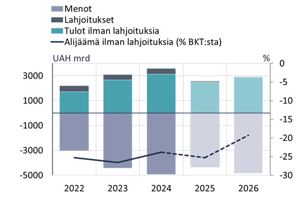 Budjettisuunnitelmassa Ukrainan julkisen talouden ensi vuoden alijäämäksi ennakoidaan noin 1 900 mrd. hryvniaa (42 mrd. dollaria) tai 19 % BKT:stä. Ukrainan finanssiministeriön mukaan ensi vuodelle tarvittavasta rahoituksesta puuttuu 18 mrd. dollaria. Suurimmat rahoituslähteet ovat ensi vuonnakin Venäjän keskuspankin jäädytettyjen varojen tuottoja hyödyntävä G7-maiden Extraordinary Revenue Acceleration (ERA) -lainaohjelma sekä EU:n Ukraina-tukiväline.
