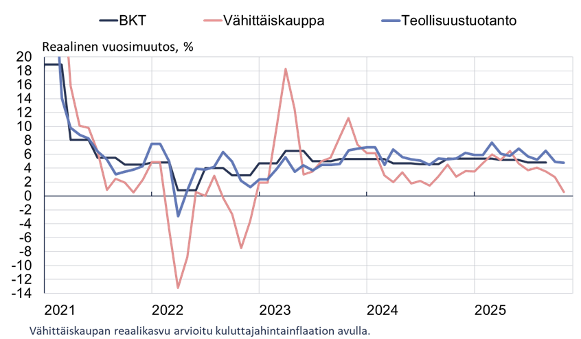 Kiinan tilastoviraston mukaan teollisuustuotannon kasvu hidastui marraskuussa 4,8 prosenttiin ja vähittäiskaupan reaalikasvu arviolta 0,6 prosenttiin vuotta aiemmasta. Myös kiinteiden investointien kehitys heikkeni, kun nimellisten investointien supistuminen kiihtyi 2,6 prosenttiin tammi-marraskuussa. Kiinteiden investointien viime kuukausien reaalikasvusta ei ole julkaistu tietoja, mutta reaalisesti koko vuoden kiinteät investoinnit eivät välttämättä supistuneet, sillä kesäkuulta saatujen tietojen mukaan investointien hintojen lasku oli kahden ja kolmen prosentin välimaastossa. Kuluttajahintojen nousu on sen sijaan hieman kiihtynyt viime kuukausina, mutta hintojen nousu on edelleen hidasta (0,7 % vuotta aiemmasta marraskuussa). Marraskuussa inflaatiota vauhditti mm. ruoan hinnan laskun päättyminen.