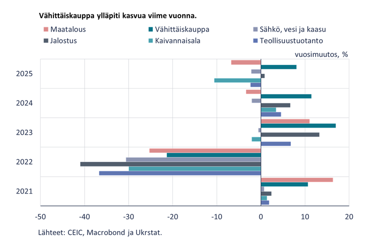 Pula energiasta ja tärkeiden tuotantolaitosten menetykset supistivat teollisuustuotantoa vuonna 2025 (vuosimuutos -2,4 %). Kaivannaisalan tuotanto laski 11 % vuoden takaisesta, kun öljyn- ja kaasun tuotanto kärsi hyökkäyksistä ja Pokrovskin merkittävä hiilikaivosalue miehitettiin vuoden alkupuolella. Pula koulutetusta työvoimasta ja sähkökatkokset erityisesti vuoden lopulla olivat merkittäviä pullonkauloja kaikilla teollisuuden aloilla. Jalostusteollisuudessa kasvu jatkui (1 %) ennen kaikkea puolustukseen liittyvien alojen ansiosta. Puolustusteollisuus ja erityisesti droonien tuotanto ovat nousseet Ukrainan talouden valopilkuiksi ja niistä odotetaan myös vientimenestystä tulevaisuudessa. Ukrainan talouden selviytymisestä ja puolustusteollisuuden noususta voi lukea lisää uudesta BOFITin blogista.
