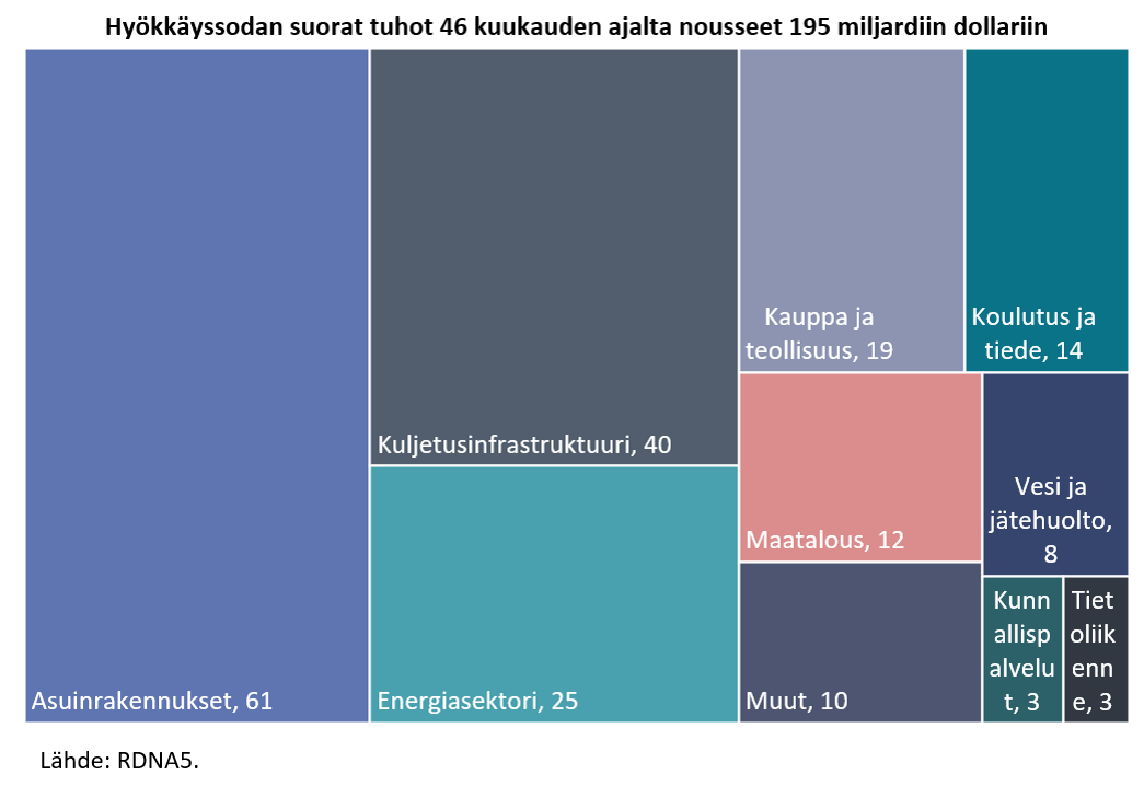 Täysimittaisen sodan suorat tuhot olivat vuoden 2025 lopussa 195 miljardia dollaria (166 miljardia euroa), joka on noin 11 % enemmän kuin vuoden 2024 lopussa. Suurimmat tuhot keskittyvät asuinrakennuksiin, kuljetuksen ja logistiikkainfrastruktuuriin sekä energiasektoriin. Viime vuoden aikana sodan tuhot kuljetussektorilla kasvoivat eniten (24 %) erityisesti rautatieverkostoon ja satamiin kohdistettujen iskujen takia. Energiasektorin tuhot lisääntyivät myös yli viidenneksellä vuoden 2025 aikana. Alueellisesti rintamalinjan lähellä olevat alueet ja suurkaupungit ovat kärsineet eniten.
