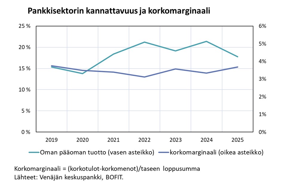Venäjän rahoitusjärjestelmä on hyvin pankkikeskeinen, ja länsimaiden asettamat talouspakotteet ovat vain lisänneet kotimaisen pankkisektorin merkitystä rahoituksen lähteenä. Lisäksi osa julkisen sektorin tuesta sekä yrityksille että kotitalouksille kanavoidaan pankkilainojen kautta. Pankkien luotonanto onkin kasvanut nopeasti kesästä 2022 alkaen, mutta kasvuvauhti hidastui selvästi viime vuonna. Vuonna 2025 pankkien myöntämä lainakanta kasvoi 17 % edellisvuoteen verrattuna.
