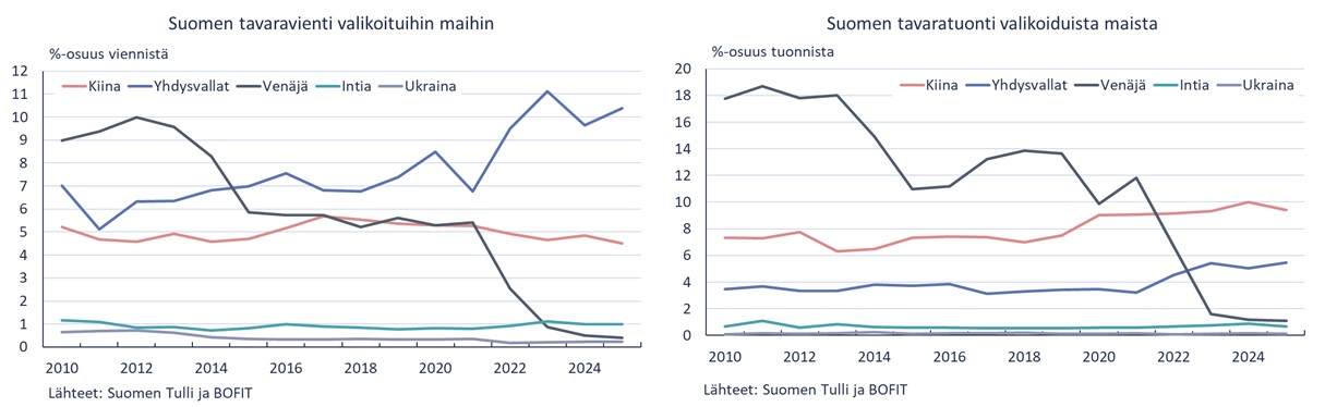 Suomen tullin mukaan tavaratuontia Kiinasta kertyi viime vuonna 7,1 mrd. euroa, joka oli 5 % vähemmän kuin vuonna 2024. Kiinan vientihintojen yleisen laskun vuoksi Suomeen tuodun kiinalaisen tavaramäärän lasku oli luultavasti vähäisempää kuin arvon lasku. Kiinan osuus koko tavaratuonnin arvosta supistui 9,4 prosenttiin. Tavaratuonti Taiwanista kaksinkertaistui viime vuonna, ja Taiwanin osuus tuonnista kasvoi 2 prosenttiin. Tullin tilastojen mukaan EU:n osuus Suomen tavaratuonnista oli 58,3 %, Yhdysvaltojen 5,5 %, Intian 0,7 % ja Venäjän 1,0 %, ja Ukrainan 0,1 %.