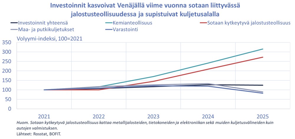 Kasvu jatkui viime vuonnakin kemianteollisuuteen ja sotaan kytkeytyvään teollisuuteen suuntautuvissa investoinneissa. Nopeimmin kasvavien toimialojen joukossa olivat muiden kulkuneuvojen kuin autojen valmistus (investointien määrä kasvoi 60 %) ja kemianteollisuus (kasvua 30 %). Alueellisesti investointien kasvu oli nopeaa mm. Leningradin alueella kemianteollisuuden tukemana sekä Kaukoidässä Juutalaisten ja Tshuktshien autonomisilla alueilla kaivannaisteollisuuden ja infrastruktuuriprojektien vetämänä.