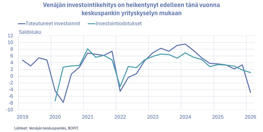 Investointikehitys heikkeni laaja-alaisesti, mutta etenkin budjettirahoitteisten Kaukoidän alueiden infrastruktuuriprojektien päättymisellä oli negatiivinen vaikutus investointeihin. Investointien rakenne on viime vuosina muuttunut Venäjällä huomattavasti. Yritykset rahoittavat investointeja entistä enemmän voittovaroistaan ja budjettirahoitus on tarkemmin kohdennettua. Investointien ulkomainen rahoitus on tyrehtynyt lähes täysin. Investoinnit ovat painottuneet rakentamiseen kone- ja laiteinvestointien osuuden supistuessa. Nopeinta kasvua on nähty sotaan kytkeytyvillä teknologiateollisuuden aloilla sekä kemianteollisuudessa. Lisäksi infrastruktuuriprojektit ovat tukeneet investointeja etenkin Kaukoidässä, mutta nyt ne alkavat tulla päätökseen. Heikointa investointikehitys on ollut niillä toimialoilla ja alueilla, joiden vientiä länsimaiden asettamat pakotteet ovat rajoittaneet.
